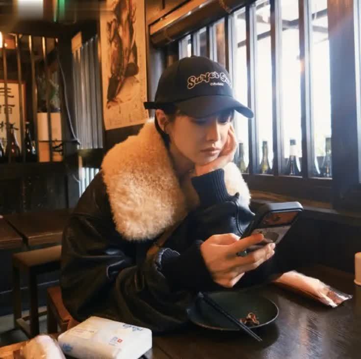 而斜跨的黄色单肩包则是整套造型的点睛之笔。在全黑的主色调中,明亮的黄色瞬间抓住视线,为沉闷的秋冬穿搭注入活力,同时也让造型更具层次感与时尚个性。头戴的蓝色字母棒球帽,再次为造型增添了一抹亮色,与黄色包包形成色彩呼应,既打破了全黑造型的单调,又展现出宋茜随性不羁的时尚态度。内搭的灰色立领针织衫,简约舒适又不失质感,立领设计增添了几分干练,与整体的酷飒风格完美融合。