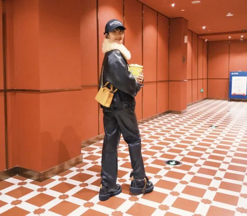 在搭配上,宋茜深谙“全身同色显高级,亮色点缀吸睛”的时尚法则。下半身选择黑色皮裤,与黑色皮衣形成全黑搭配,统一的色调让造型更具整体感,同时皮裤的紧身版型勾勒出纤细的腿部线条,与皮衣的宽松版型形成“内紧外松”的穿搭逻辑,既优化了身材比例,又增强了造型的帅气感。脚踩黑色厚底马丁靴,进一步强化了酷飒风格,厚底设计还能悄悄增高,让身形更显挺拔。